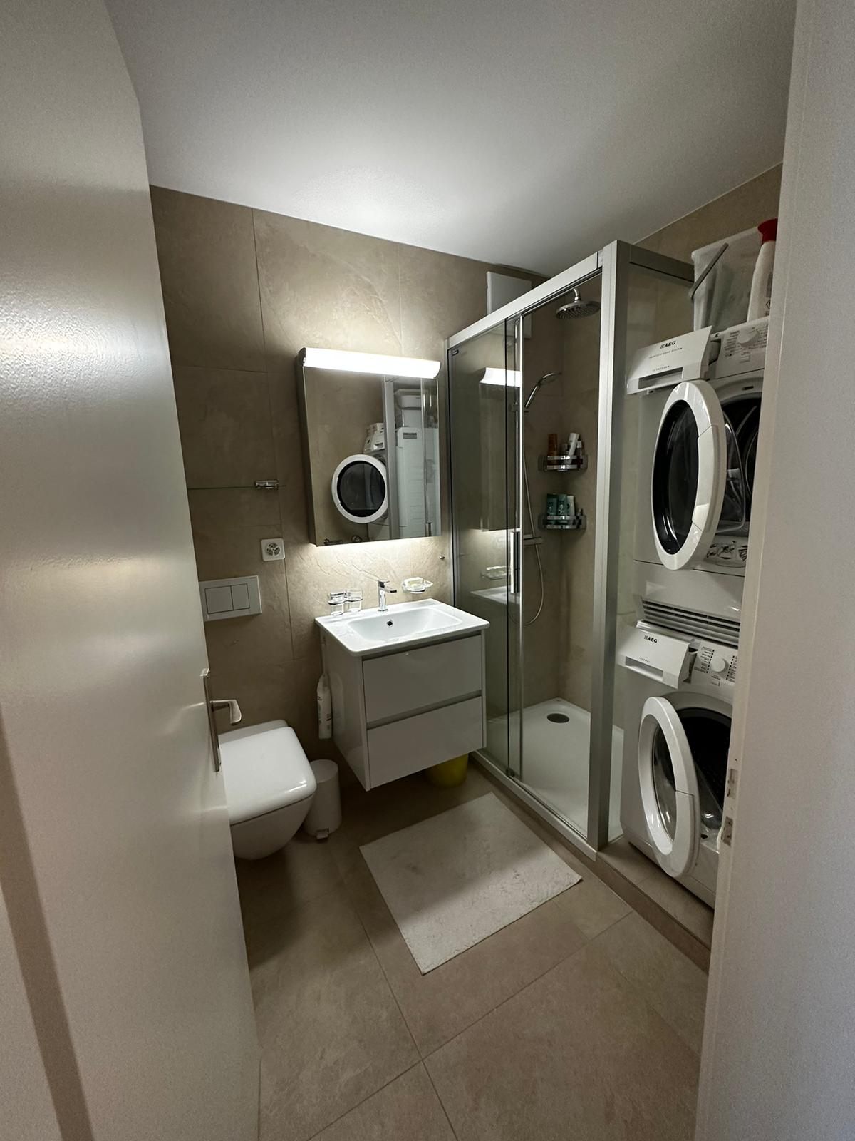 - Badezimmer mit Toilette/Dusche und Waschmaschine sowie Tumbler